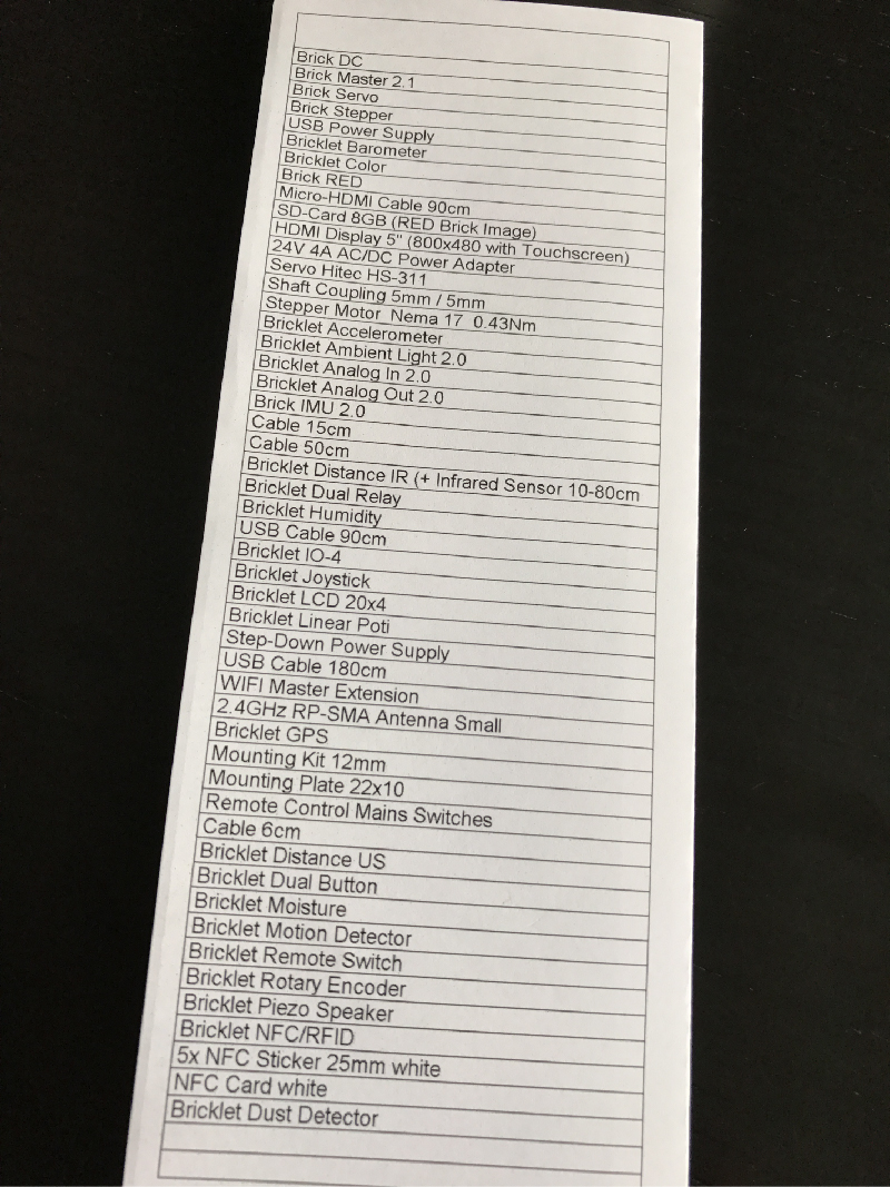 See our 2015 blog article, it’s still current: Tinkerforge blog article. You can see a list of the available stuff in this picture.